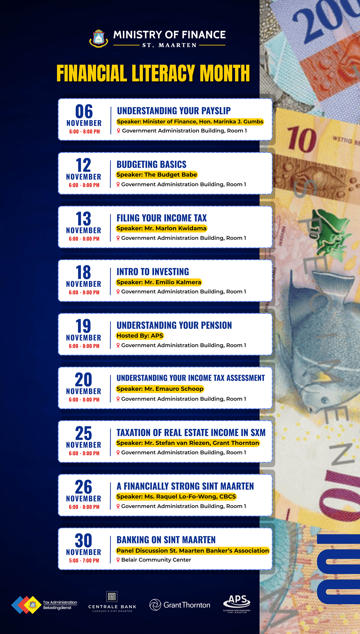 Another highlight of this year’s program is the “Banking in Sint Maarten” Panel Discussion, hosted in collaboration with the St. Maarten Bankers Association, taking place on November 30, 2025 at the Belair Community Center. This event will bring together key stakeholders to discuss how banking functions locally, challenges residents face, and opportunities to support personal financial goals.
