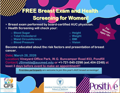 GREAT BAY, Sint Maarten (DCOMM) – On Saturday, March 28, the American University of the Caribbean (AUC) will launch their annual free breast exam and health screening program for 2026. Women 18 years and older, and first-time participants are encouraged to sign-up.