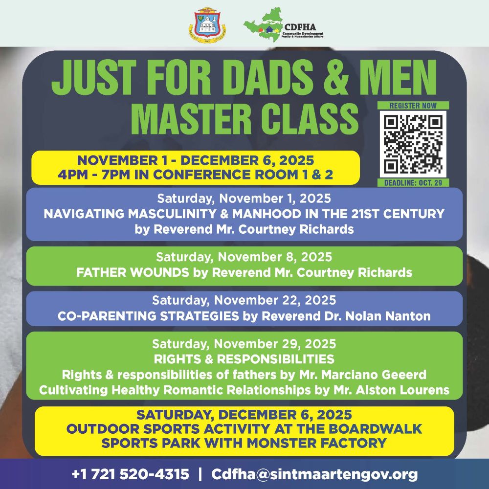 Space is limited, and early registration is highly encouraged. This is a unique chance to join a community of men committed to becoming better fathers, mentors, and leaders. Participants that attend at least 80% of the sessions will receive a Certificate of Participation. Registration ends on Wednesday October 29, 2025. For more information or to register, simply send us an email at cdfha@sintmaartengov.org,Facebook@cdfhasxmgov or call +1721-5204315.