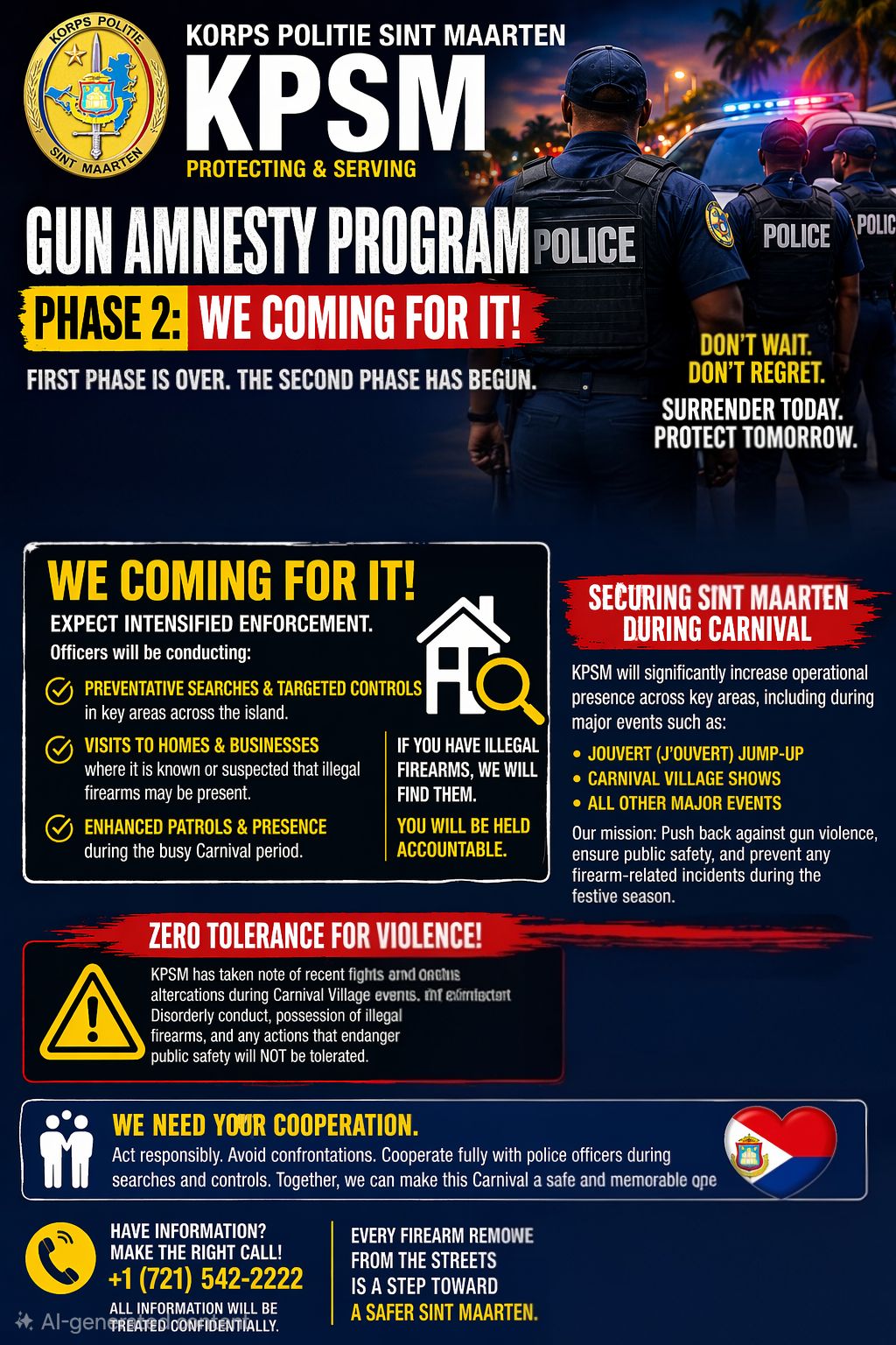 As the island prepares for the heightened activities surrounding the Carnival period, KPSM will also significantly increase its operational presence across key areas. Enhanced patrols and controls will be conducted during major events such as the Jouvert (J’ouvert) Jump-Up and scheduled shows in the Carnival Village, with the aim of preventing any firearm-related incidents and maintaining public safety.
