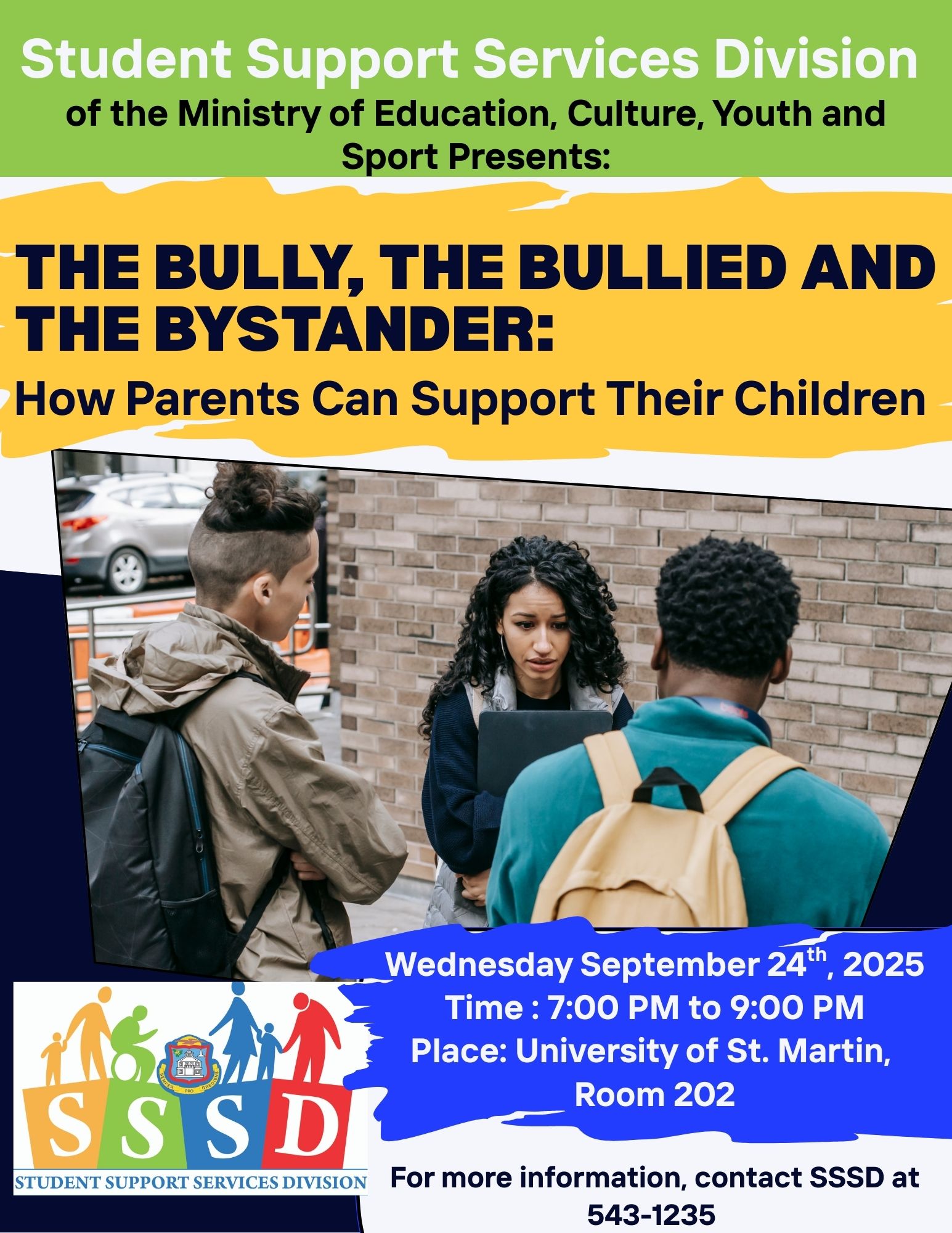 The Student Support Services Division (SSSD) of the Ministry of Education, Culture, Youth and Sport will host an informative session titled “The Bully, The Bullied, and The Bystander: How Parents Can Support Their Children” on Wednesday, 24 September 2025, from 7:00 P.M. to 9:00 P.M. at the University of St. Martin.