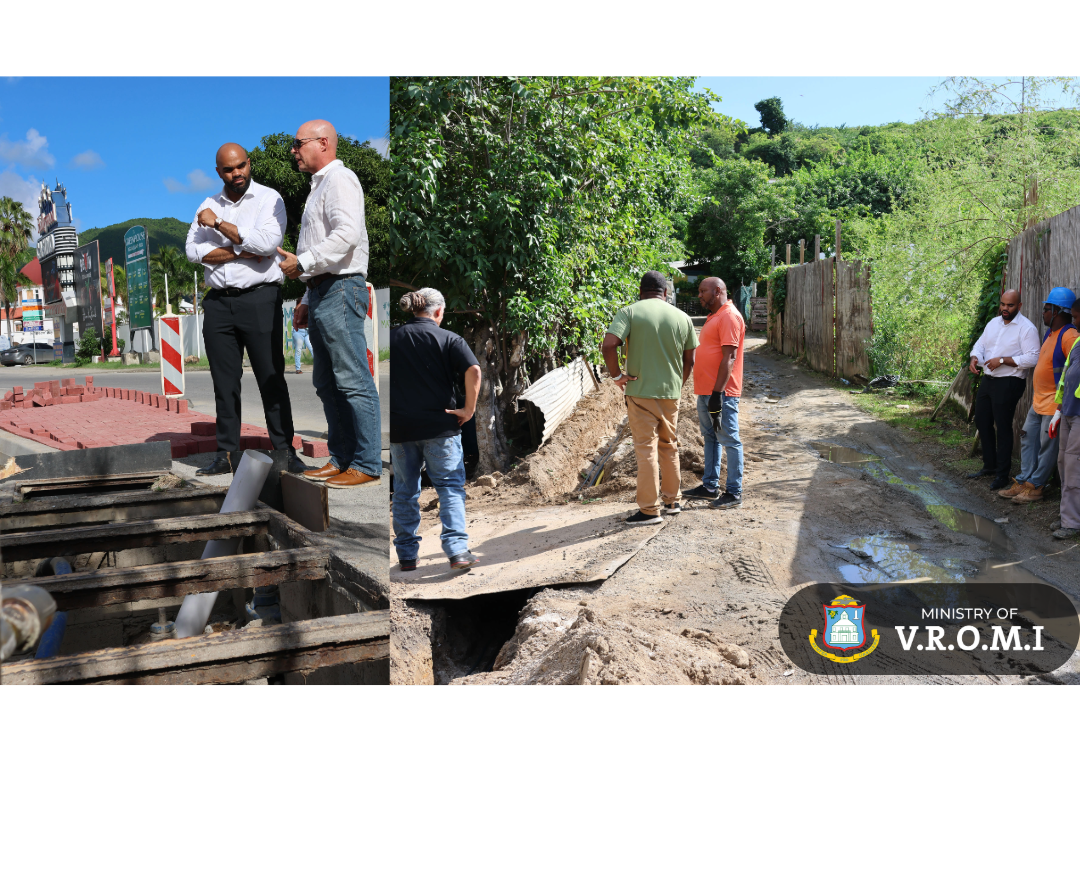 The Ministry of Public Housing, Spatial Planning, Environment and Infrastructure (VROMI) is pleased to announce progress on two projects, the first being the project to strengthen utility infrastructure and the second being the Private-Public Partnership to rehabilitate Billy Folly Road (Pelican). The Utility Infrastructure Project follows from the agreement signed in May by VROMI, NRPB, and GEBE to the tune of USD$5.1 million dollars to introduce electrical cables and drinking water pipes in Cole Bay, South Reward, Pointe Blanche, and A.T. Illidge Road (area of Madame Estate, Middle Region, and Dutch Quarter). Minister of VROMI Mr. Patrice Gumbs was on site on Friday at the intersection of A.T. Illidge Road and Gibbs Drive to inspect the works with the team from the Infrastructure Department.