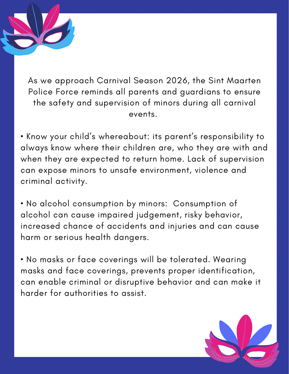 As Carnival Season 2026 approaches, the Sint Maarten Police Force is reminding parents and guardians to ensure the safety and supervision of minors during all carnival events.