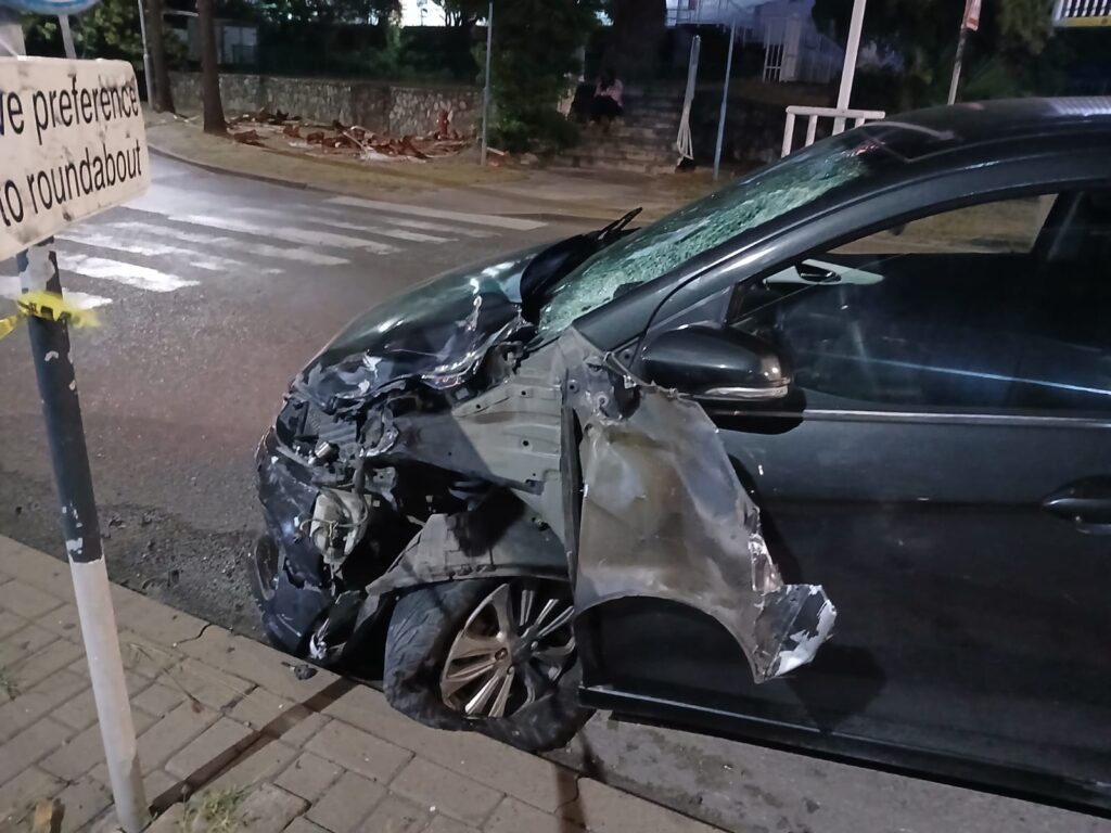 A motorcycle and a Chevrolet Spark passenger vehicle were involved in a serious accident. The driver of the Chevrolet Spark was travelling along Buncamper Road toward the Freedom Fighters Roundabout when the motorcyclist, approaching from Sucker-garden Road, entered the roundabout in the wrong direction before proceeding onto Buncamper Road, colliding with the left side of the vehicle.